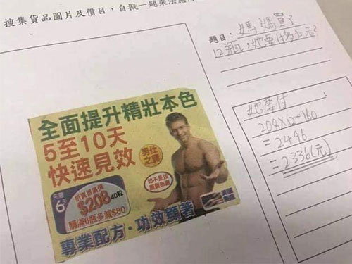 一名香港小学生从报章上剪下一则男性保健品的广告剪报,贴在活页练习纸上当做数学应用题的图片,该广告的广告词引人遐想,写着“全面提升精壮本色,5至10天快速见效,专业配方,功效显著,只限6天,1瓶40粒208港元(约111令吉),购买6瓶折扣80港元(约42.8令吉)”。