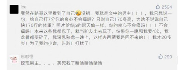 “照片给你p的跟天仙一样,你的良心不会痛吗!!!不会痛吗!本来这些我都忍了,就当驴友出去玩了,结果你一晚和我要4次,我盆骨都要碎了,我深思熟虑一晚上,这样去西藏我是回不来的!!我才20多岁!为了我的小命,告辞!打扰了!”