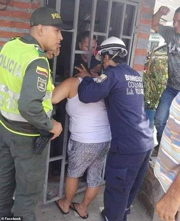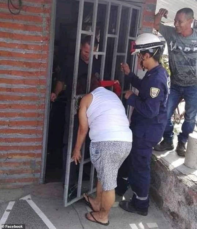 哥伦比亚这名大妈很八,八到伸头进去邻居家门,结果头被卡住!