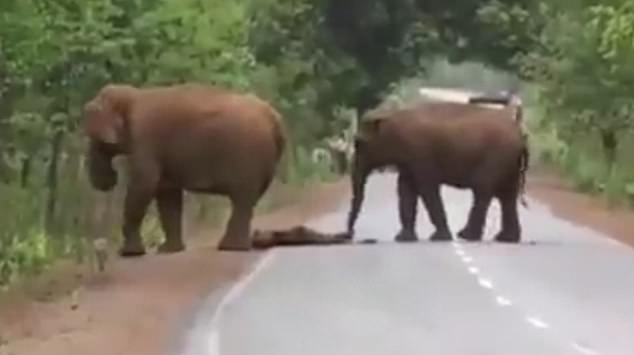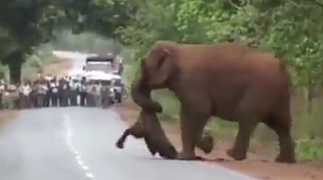 喀斯旺日前上传的短片显示,1只成年大象吊着小象的尸体横越马路,并停在马路旁暂时把小象放下,等待其他像群跟上后再吊起小象,整列送葬队伍继续往树林前行,一旁的人车也停下,等待象群经过。