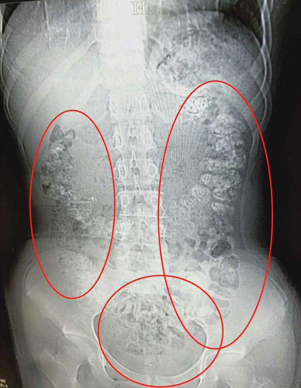 5月28日晚,女孩小沈(化名)在父母陪同下到浙江诸暨市人民医院急诊,说肚子疼,几天无法排便,也吃不下东西。接诊医生张楼炜见她肚子鼓鼓的,便安排了腹部CT,检查结果让他一惊:患者胃部、横结肠、升结肠、降结肠、乙状结肠,一直到肛门,全是颗粒状阴影,足有百余颗。