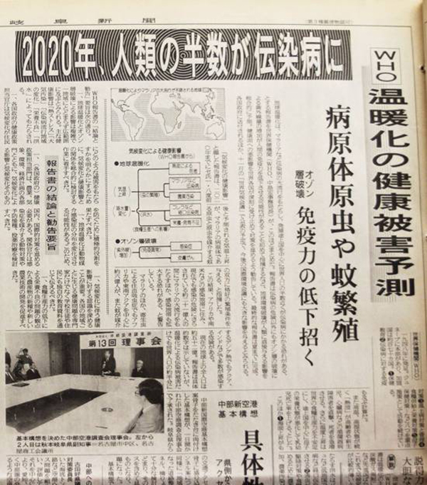 这篇报道的标题是由岐阜新闻记者所总结的,文章总结了当时世界卫生组织关于全球变暖对人类健康造成威胁的一份预测。这份世卫组织的报告书中称,随着全球变暖,全世界可能会发生疟疾一类的传染病大流行,近半数的世界人口将患上传染病。