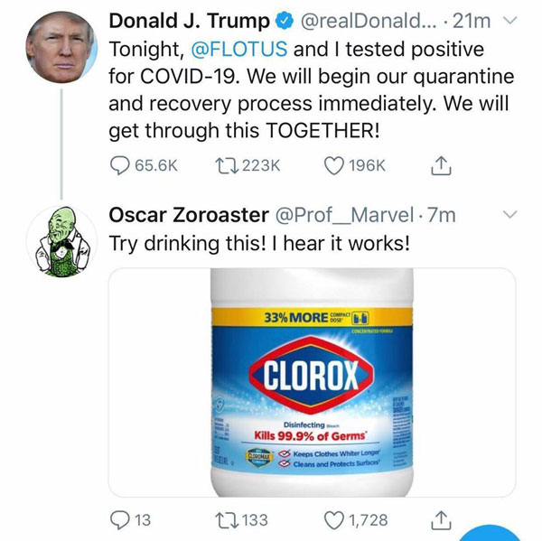 美国总统特朗普确诊新冠,许多网民忧心不已,纷纷建议他老人家服用漂白水,因为”听说有用。“