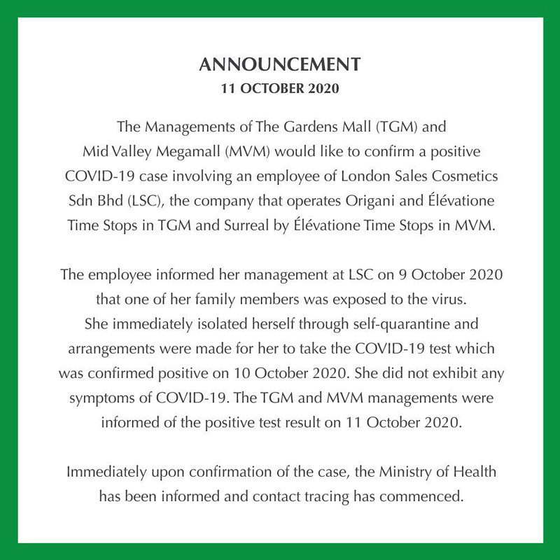 (吉隆坡11日讯)The Gardens Mall和谷中城购物商场的伦敦销售化妆品有限公司( London Sales Cosmetics Sdn Bhd)员工确诊新冠肺炎!