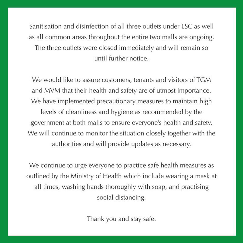 购物商场管理层发文告指出,卫生部目前已展开追踪密切接触者工作,而购物中心也已经进行消毒工作,希望其他员工和所有消费者放心。