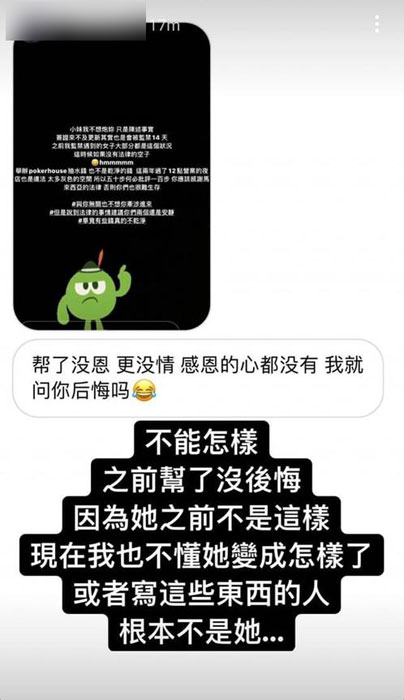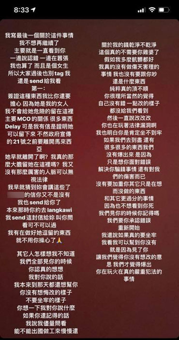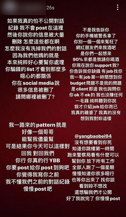 他在另一则贴文中,指其网红女友是合法逗留我国,没有签证问题,也强调自己没有做过伤天害理的事,同时澄清自己没有告诉杨宝贝指手机被警员拿走,希望对方不要冤枉人。