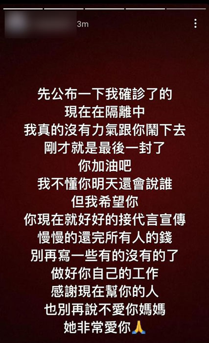 他在Instagram限时动态发文自爆,本身已确诊感染新冠肺炎,如今在隔离中,因此坦承已无力气和杨宝贝闹下去。