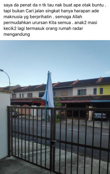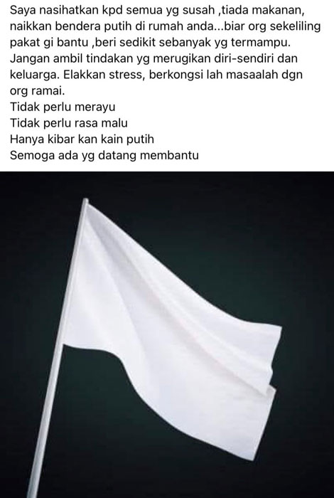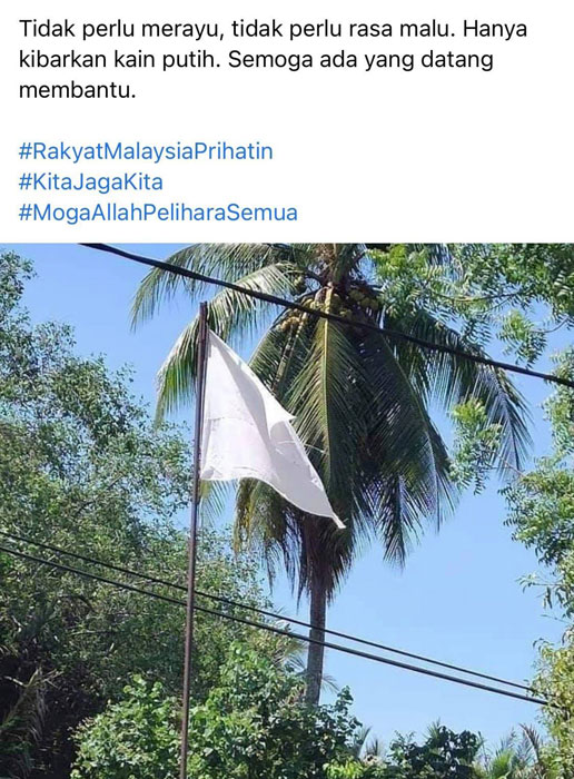 (吉隆坡28日讯)疫情及行动管制令,造成许多民众生计备受影响,有网民发起举旗行动,号召面临困境的民众,在住家外升起白旗,向外界求助!