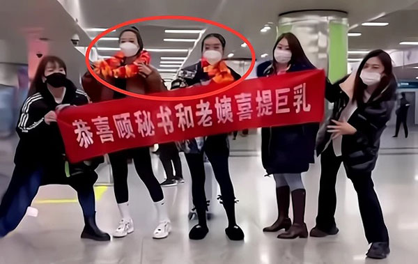 整行本来不是什么值得公开的事,但条幅上却赫然出现几个大字:“恭喜顾秘书和老姨喜提巨乳”。这让女子一阵脸红,对方姐妹团却在热烈地烘托气氛。