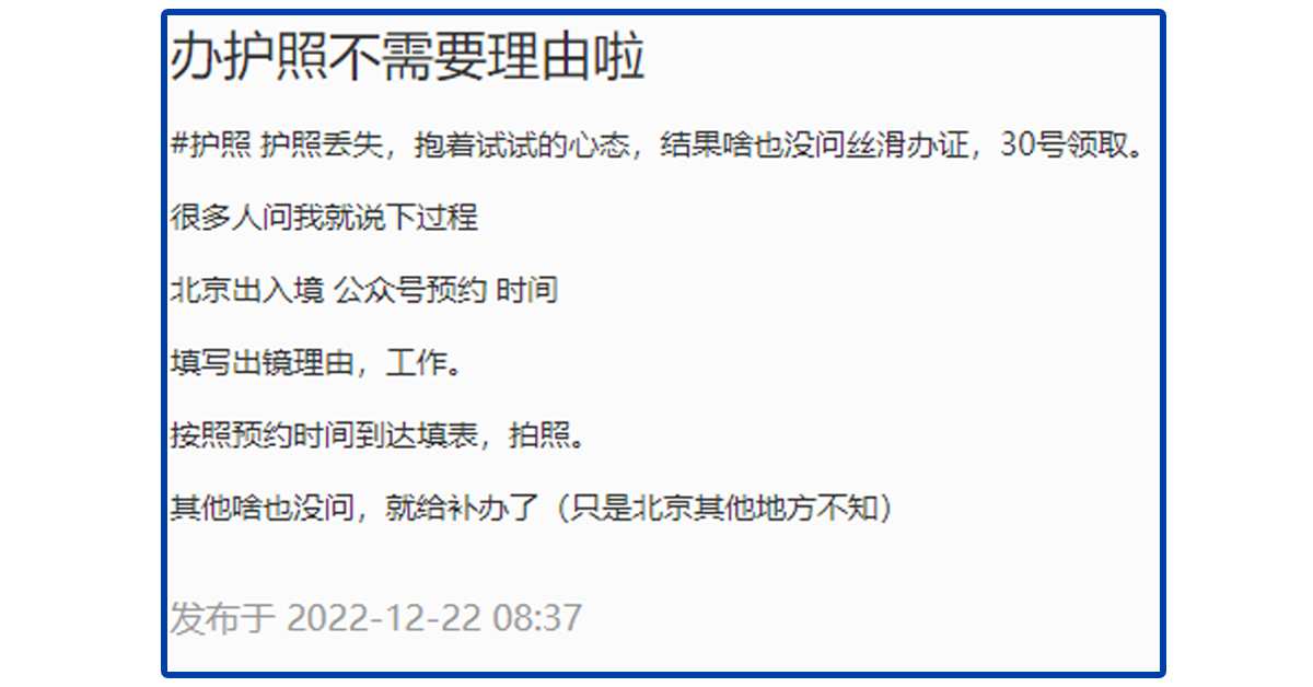据悉,有北京的网友,在22日网络发帖称,由于护照丢失,抱着试试的心态去更新护照,结果什么也没问,就“丝滑”(顺利)取得护照,并预约30日领护照。