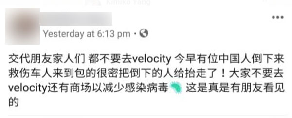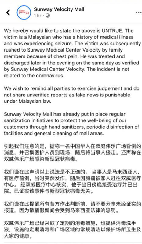 (吉隆坡1日讯)武汉肺炎病患在吉隆坡双威伟乐广场(Sunway VeloCity)病发昏倒?!假的!
