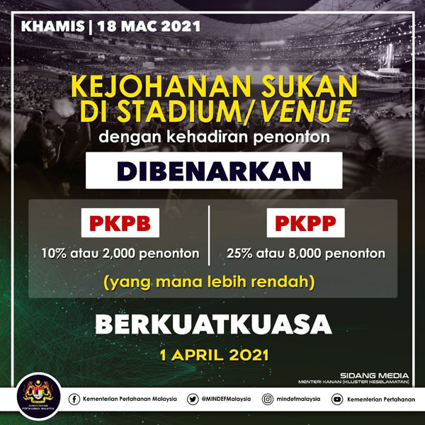 (吉隆坡18日讯)高级政务部长(国防部)拿督斯里依斯迈沙比里宣布,国家安全理事会允许观众进入体育馆内,观赏运动赛事,包括有条件行动管制令地区最多只能允许2000人,而复苏期行动管制令地区则最多8000人。