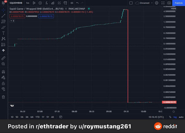 根据CoinMarketCap 的数据,SQUID 加密货币数小时前以 2,861 美元(11877令吉)的价格达到峰值,然后在美东时间上午 5:40 (大马下午5:40)左右暴跌至 0.000007美元。
