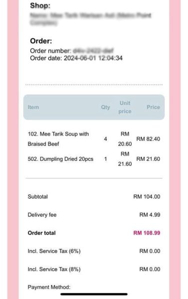 “餐馆的收据平时都是贴在塑胶袋外边,但是,这次的却是放在食物底部,拿出所有的饭盒才看到单据。”