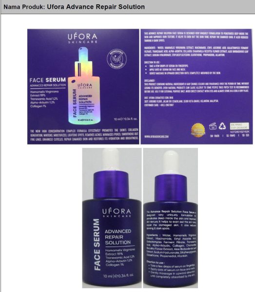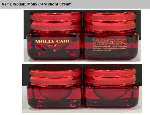 涉及护肤品为Molly Care Night Cream(含水银)、Pinkkiss Beauty Care Herbal Cream(含水银和倍他米松)、Pinkkiss Beauty Care Treatment Cream(含苯二酚、维甲酸和倍他米松)、Karisma Brightening Day Cream(含水银)和Ufora Advance Repair Solution(含苯二酚)。