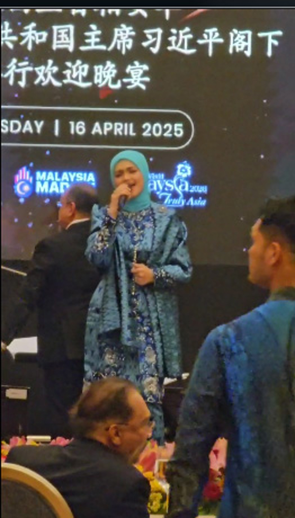 (布城16日讯)首相拿督斯里安华今晚设宴款待中国国家主席习近平,并邀来马来天后拿督斯里西蒂诺哈丽查,现场献唱名曲《月亮代表我的心》。