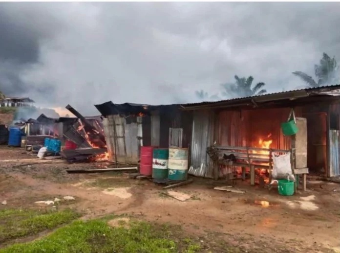 (古晋17日讯)印尼籍男子疑因私人纠纷,在油棕园持巴冷刀狂砍同乡至重伤毙命,凶徒临走前,竟纵火烧毁12间员工宿舍!