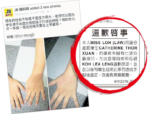 該名華裔女教師在《中國報》柔州版昨天開始刊登的道歉啟事中,坦承因過份處罰該女學生,導致後者手腳留下7道籐條印,結果登報向學生與母親道歉尋求原諒。