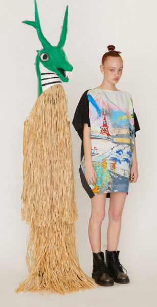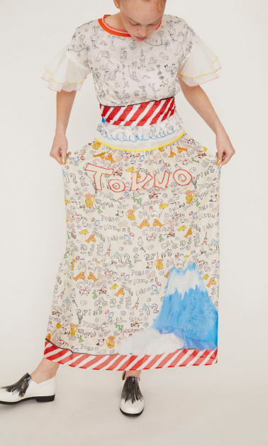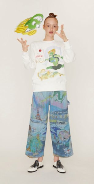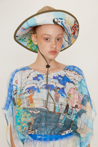 每一套服装的布面印花图案,都是一幅幅独立图画作品,有如传统和服般的意念。不穿上时,将它平展在架子上,将它变为室内的画,在她的服装作品中发现欢愉气息的少女幸福气息。