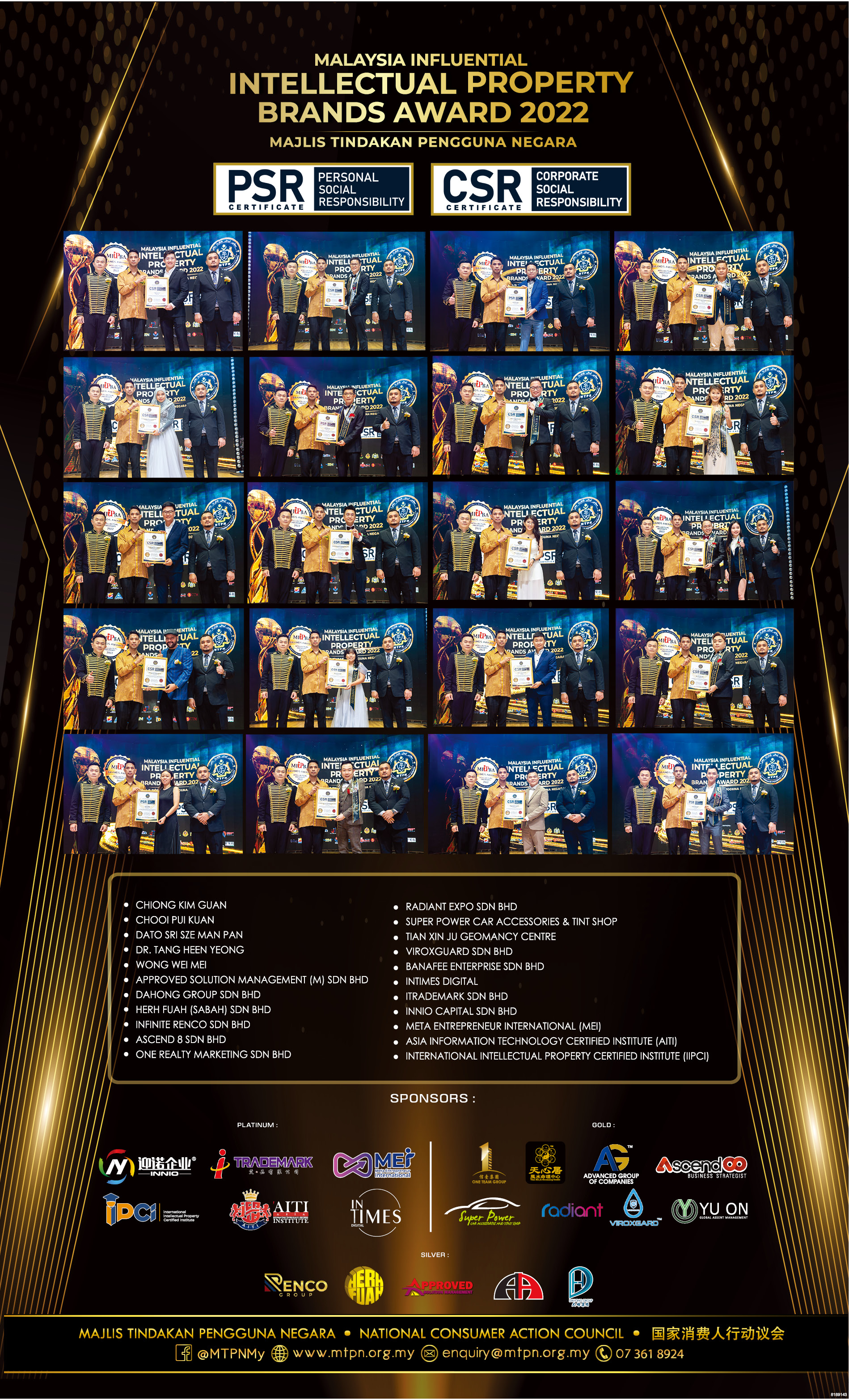 社会责任无论对企业或个人都是责无旁贷的,首度举办的“2022年度马来西亚最具影响力知识产权品牌企业大奖”,经于5月14日在新山福林园隆盛大酒家顺利举行。除了54家企业获得知识产权品牌企业大奖,主办单位国家消费人行动议会也颁发了个人社会责任及企业社会责任奖。