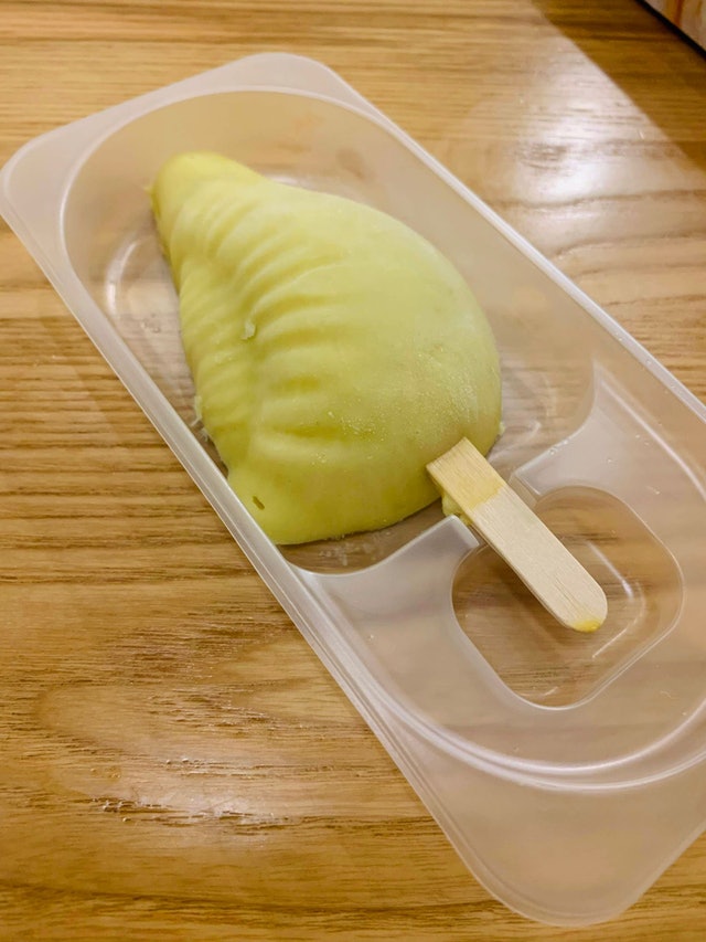 最近有网民于Facebook群组“香港雪糕关注组”分享,在便利店买到一款榴梿雪糕,不论外型或者色泽,都与真榴梿果肉有几分相似,雪糕外表为淡黄色,“胀卜卜”的卖相仿照榴梿而制成,不过味道又如何呢?