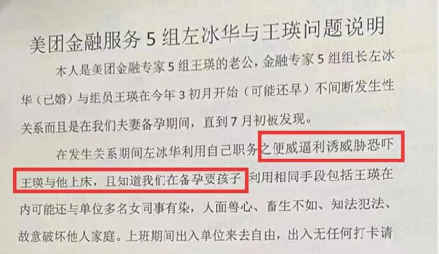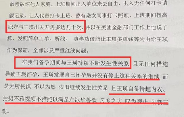 他说,王锳跟美团金融专家左冰华有不正当关系,多次开房。