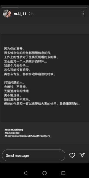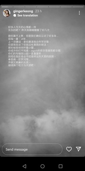 君儿日前也在IG限时动态追忆莊群施,“跟你算不上熟,但是我们确实认识了好多年,屈指一算,28年…上一次通话,是你邀请我合作贺岁歌,但是我告诉了你我没有意愿的想法,那时候我悄悄怀着小狸(儿子)…”。