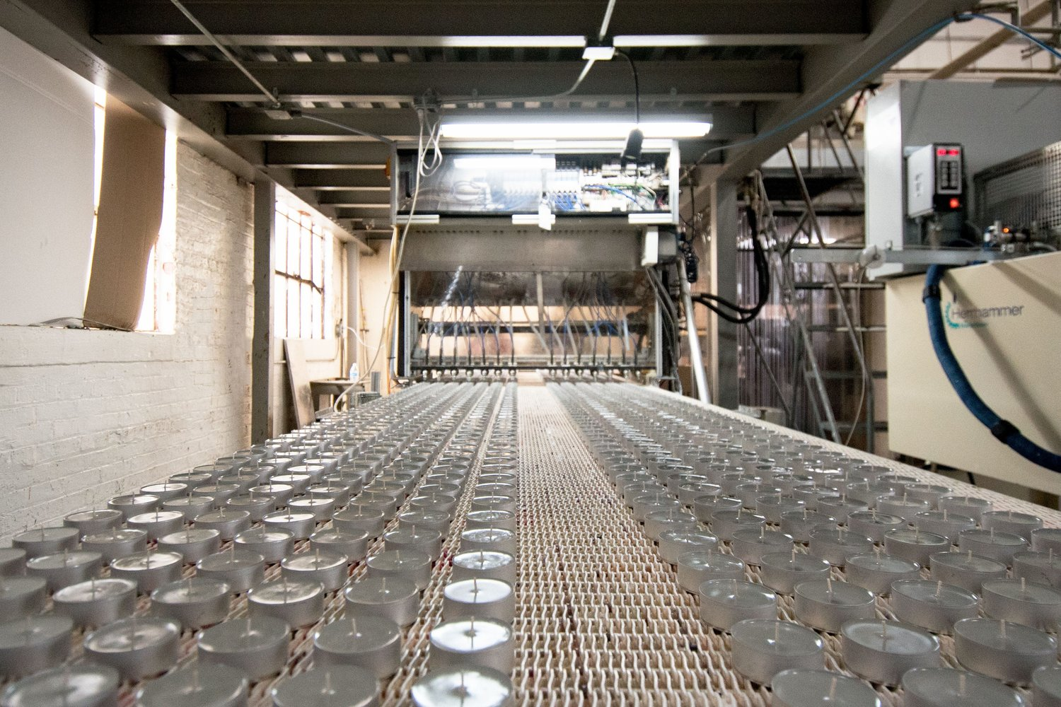但蜡烛制造业的生产线就难以完全自动化,工人必须用弯曲的尖嘴钳将烛芯拉直并置中,然后才由机器盖上盖子、贴上标签准备出货。