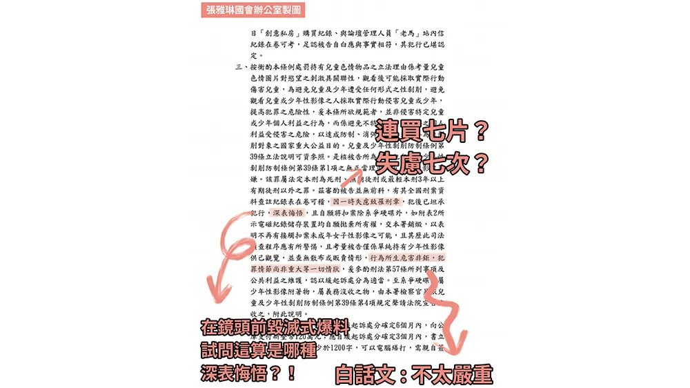 张雅琳表示看了持有7部未成年性影像案的缓起诉书理由后,实在无法接受。她指出,从非法网站“创意私房”购买性影像长达6年,但检方认为他是一时失虑,而且犯后深表悔悟,她痛批:“连买7片,失虑7次?!儿少性剥削防制条例于112年(2023年)修正,持有即是犯罪,却还继续下载!这算是哪种深表悔悟?!”