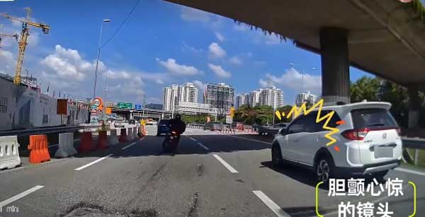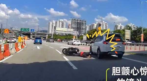 视频可见,摩哆摔倒时,他的头部与白色休旅车之间的距离非常接近,场面惊险万分;所幸休旅车司机立即朝右侧闪避,才没有酿成惨祸。
