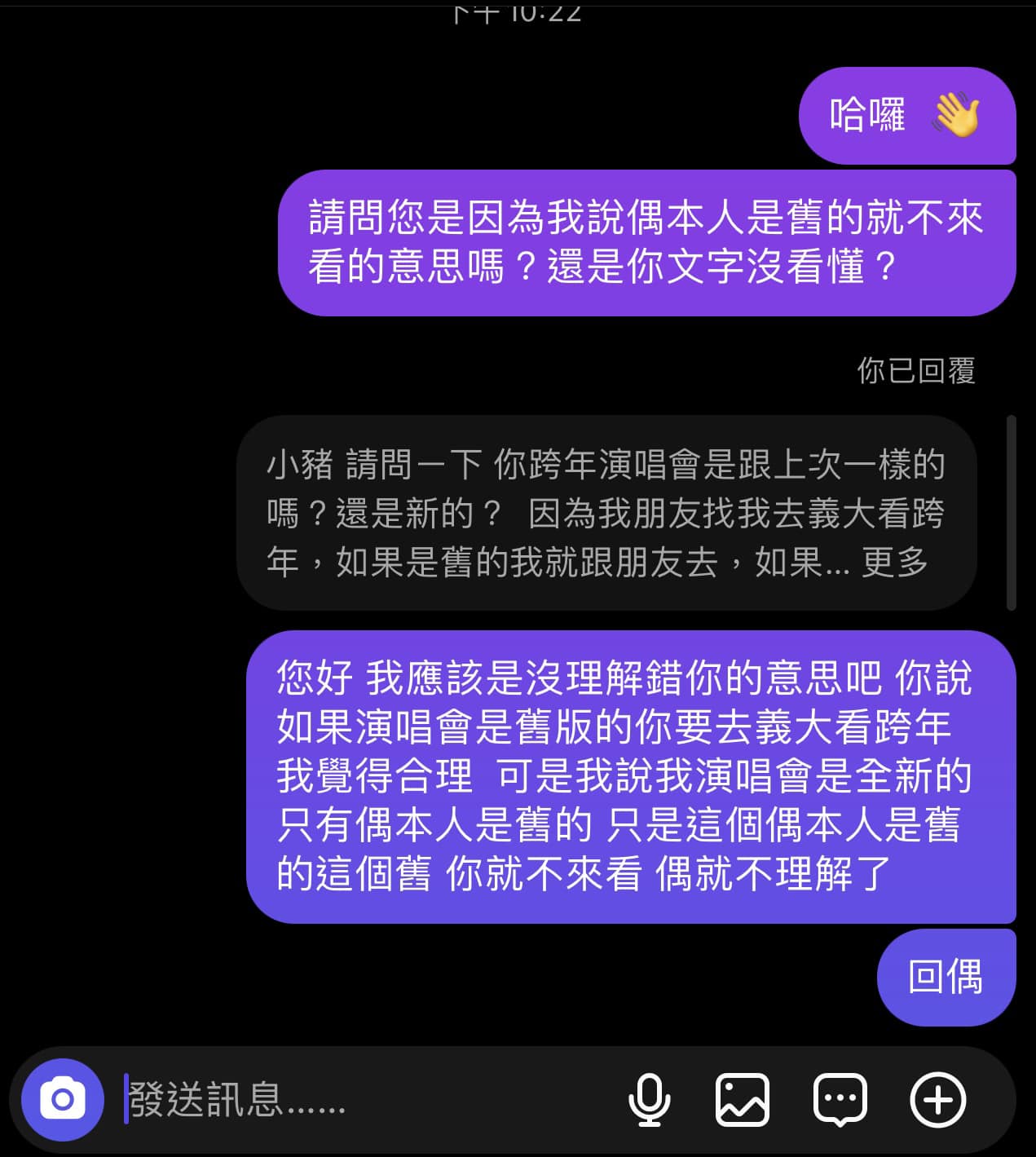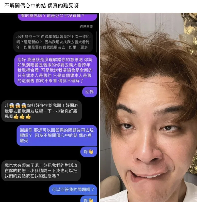 该位网友惊喜回:“哇!你打好多字给我耶!好开心我要去跟我朋友炫耀一下,小猪你好亲民哦!”罗志祥再传讯:“谢谢你,那您可以回答偶的问题后再去炫耀吗?因为不解开偶心中的结,偶心里难受。”但网友惊喜对话被明星放在动态,他还在问:“可以回答我的问题吗?嗨!”双方对话没有共识,罗志祥公开完整对话的截图,加上一张乱发崩溃的自拍,配文“不解开偶心中的结,偶真的难受呀”。