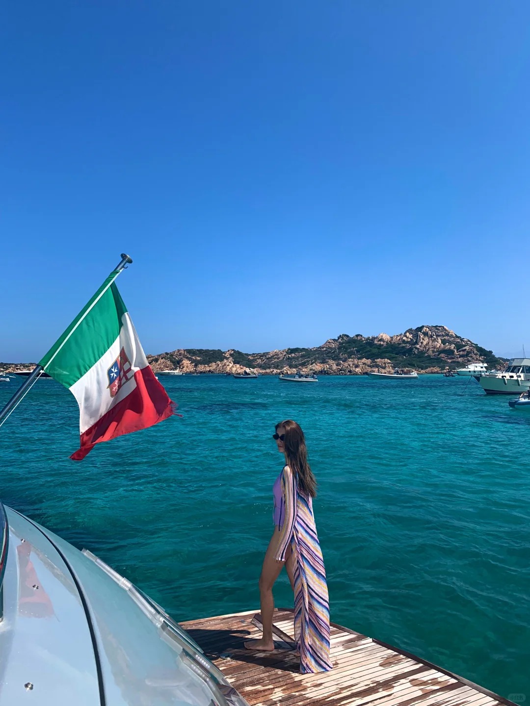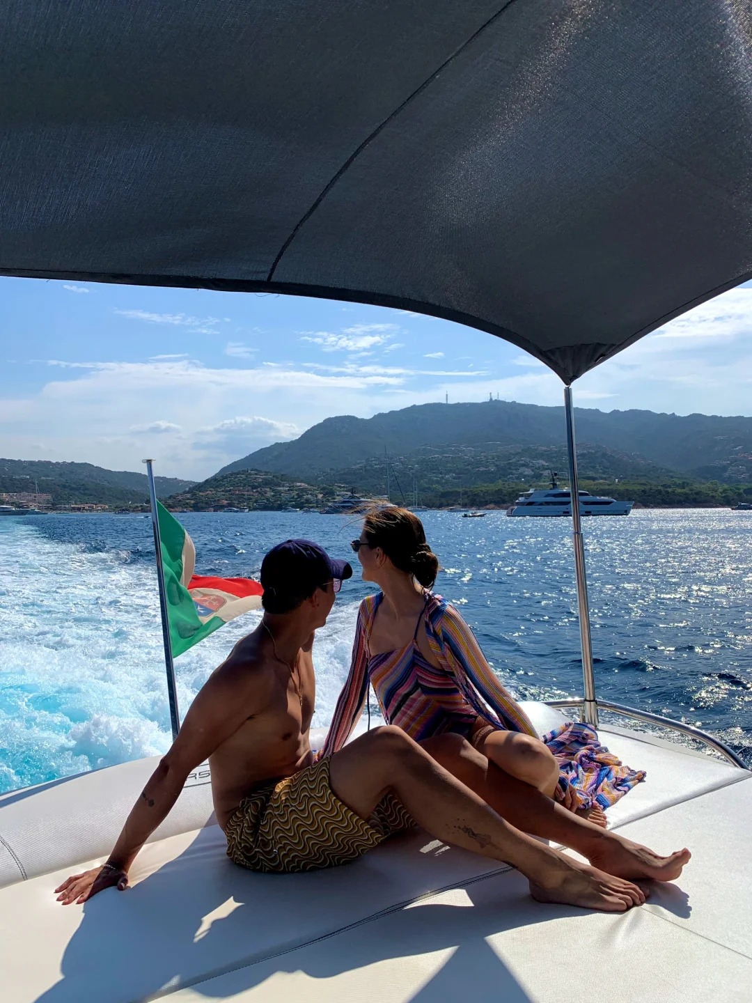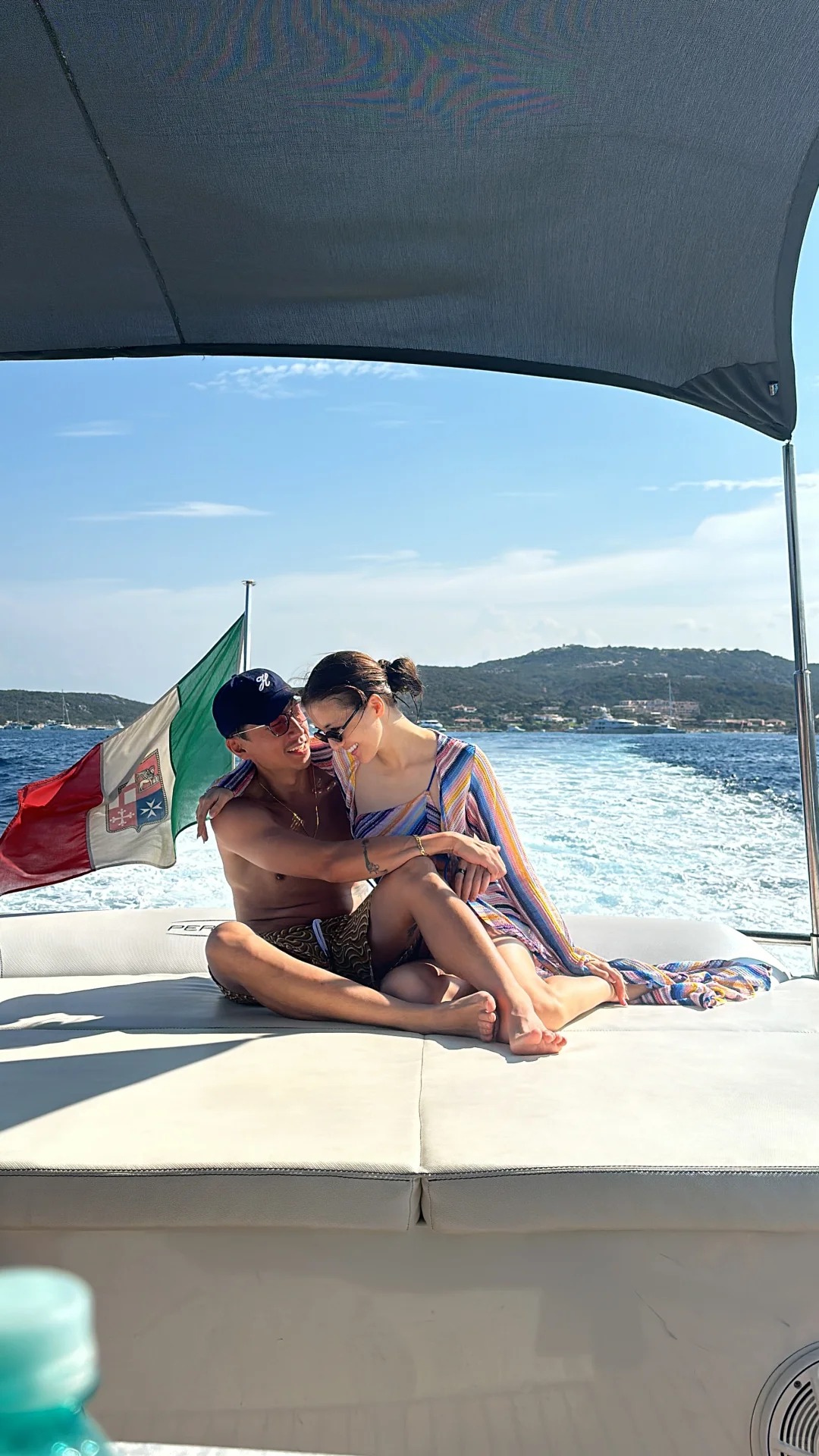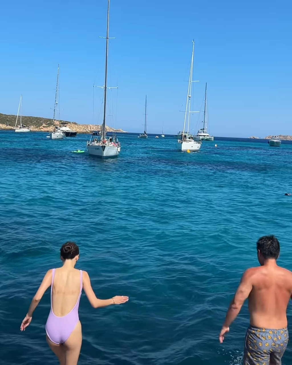 以“地中海的盛夏”为题发文,并写道:“天天都可以待在果冻海,不介意晒成一条碳。”照片中,身穿彩色线条外套的与施伯雄坐游艇出海,游艇驶至海中心时,已换好粉紫色泳衣,和老公在船尾跳下海游泳。