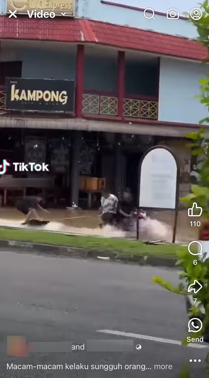 “Utara Kini”面子书昨日上载有关视频,显示一人骑着摩哆,后座乘客拉着绑在摩哆上的绳子,另一人在板上“冲浪”。