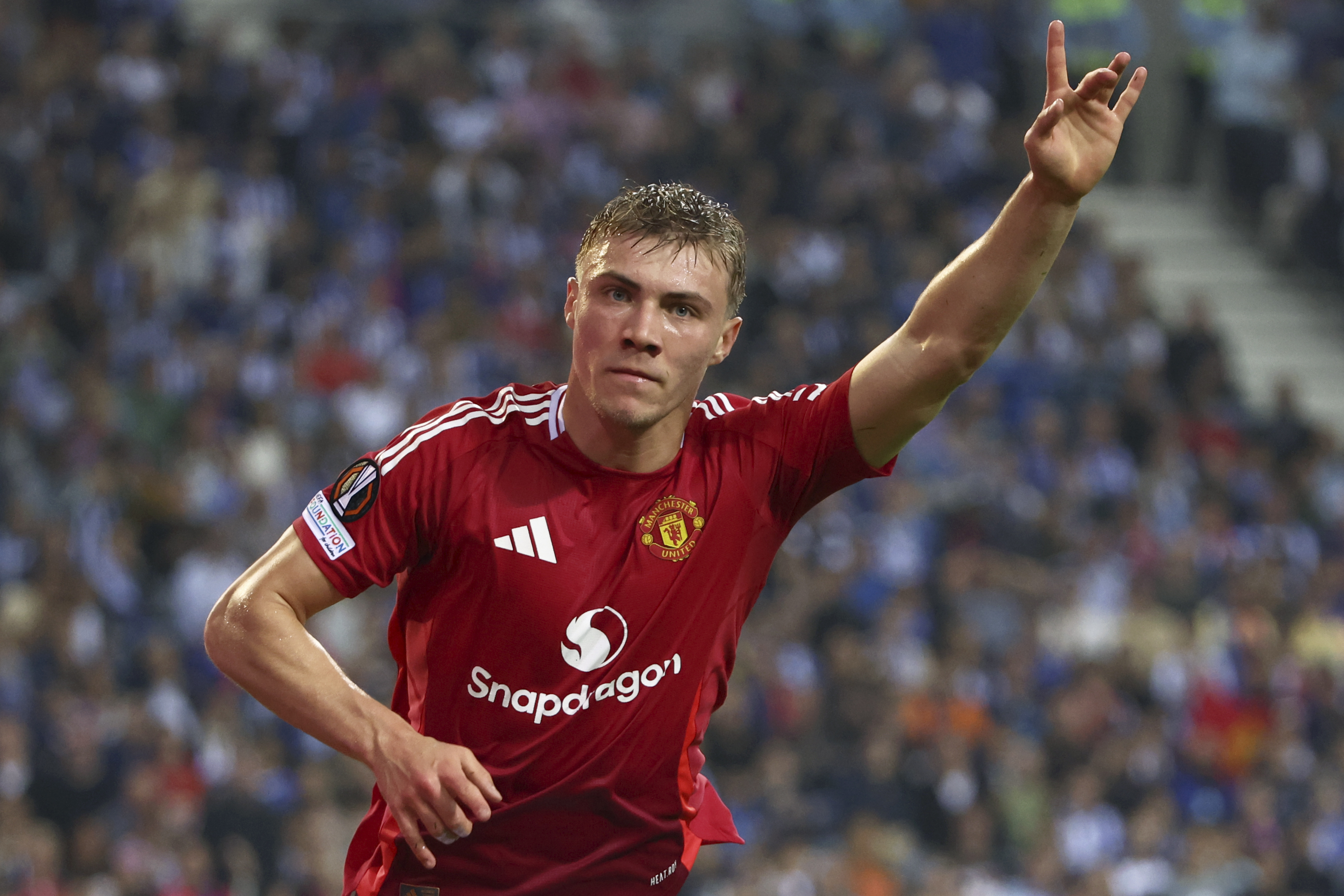 霍伊伦德攻入赛季第一球,让曼联一度2比0领先。(美联社)