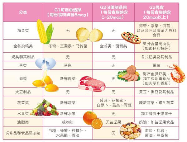 基本上,食物可按含碘量分为3类(见下表),患者应选择低碘食物,以控制病情。
