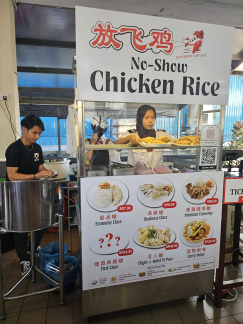 鸡饭档业者大搞噱头,以不同航班舱位作为鸡饭菜单, 更将档口命名为“放飞鸡”。