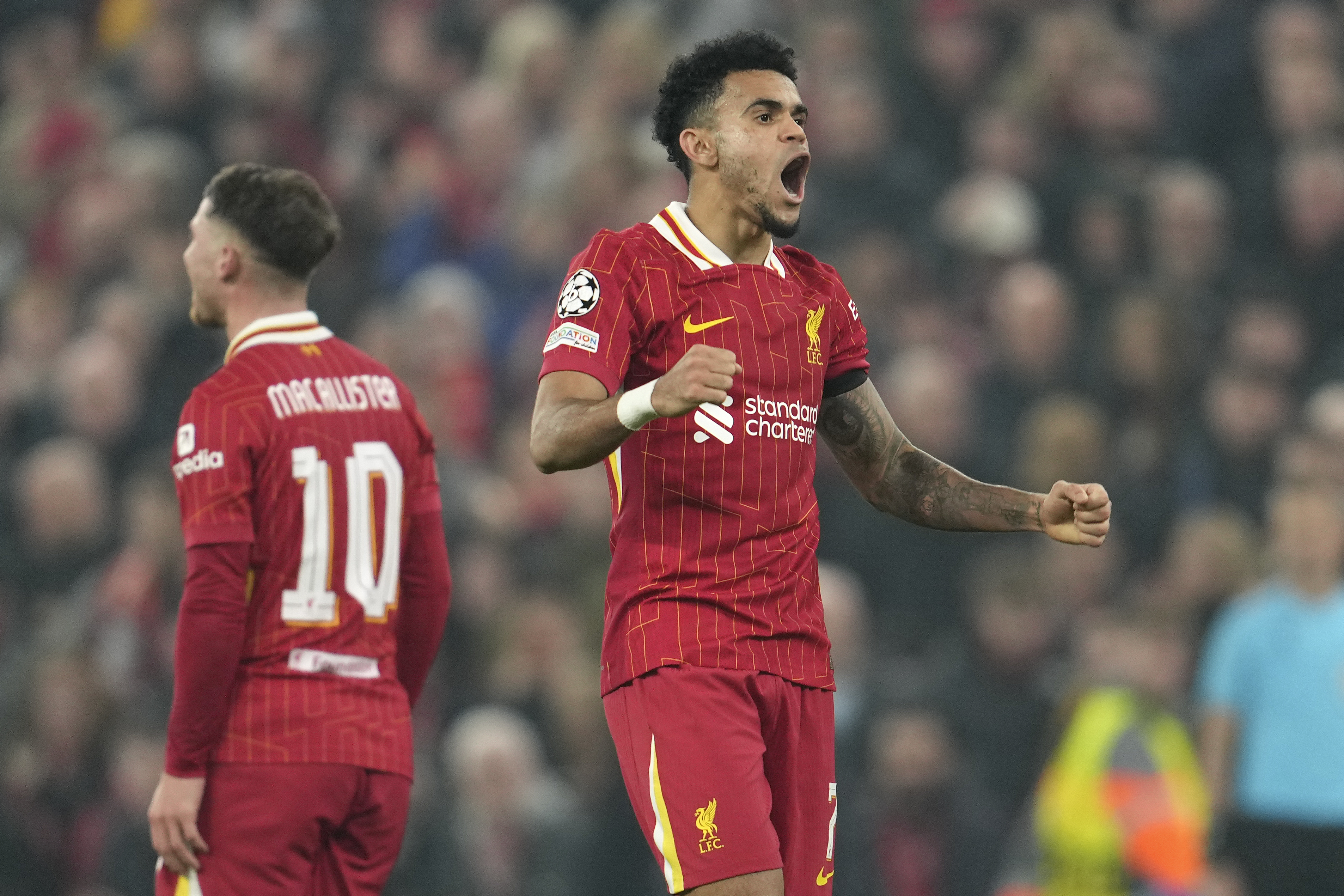 利物浦大胜莱沃库森一役,迪亚斯(右)表现抢眼。(美联社)