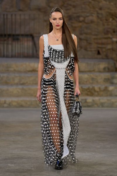Erdem、Gucci和Dior等品牌则通过精湛工艺提升系列质感,彰显优雅不失实用性。珍珠装饰和动物纹样大行其道,预示着节庆季的华丽氛围,而裸肩、透视裙裤则将性感元素融入节日时尚。