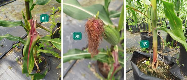 紫色玉米的玉米须、叶子和茎都带紫色;白色和黄色的玉米,须都是黄白色。