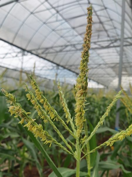 完全敞开的玉米花,用手摇晃时,可明显看到像雾气一样的花粉散落。