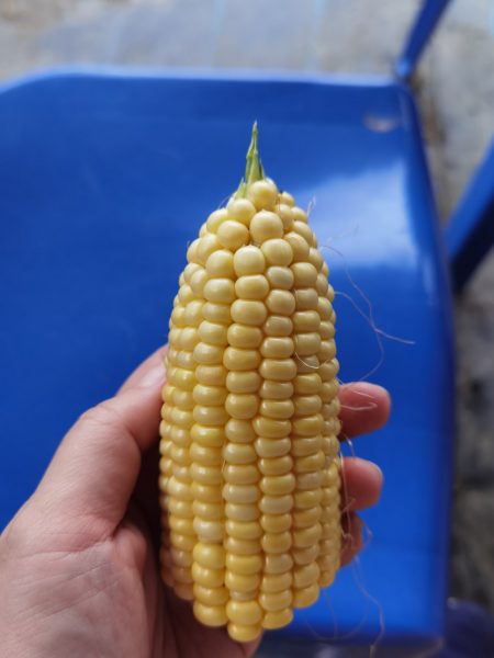 一棵玉米树会长出2~3条玉米,但他们只保留一条,让玉米的营养更集中,长得更大,其他两条玉米采收后,用来做玉米荀(小玉米)。一棵树只保留一条玉米,还有另外一个原因是,由于花粉必须掉在玉米须上,才能成功授粉,且花粉掉得越多,果实就越饱满,因此,当第2条玉米长出来时,花粉已经没之前那么多,掉到玉米须上的花粉也不多,所以,长出来的玉米也会不够饱满。玉米树只能生产玉米一次,收成后就会砍掉,树可以用来喂牛和羊。