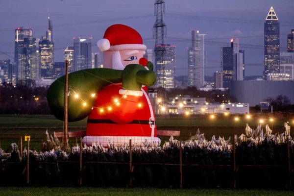 充气圣诞老人-- 德国法兰克福郊区一家圣诞树经销商,周二在摊位置放大型充气“圣诞老人”,吸引不少民众和游客前往拍照打卡。(美联社)