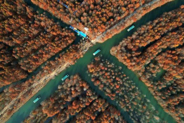 坐游船赏红杉林-- 在中国宁国市方塘乡,游客周二乘坐游船观赏红杉林。初冬时节,安徽省宣城市宁国市方塘乡的2000余亩红杉林层林尽染,进入一年中最美的时节,游客泛舟水上,宛若在画中游览。(新华社)