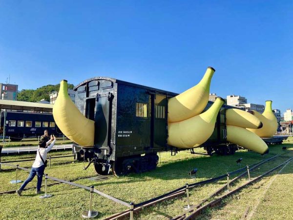 巨型香蕉装置吸睛-- 台湾滨线观光列车“哈玛星号”日前正式启航,高雄市政府周二特别设计巨型香蕉艺术装置妆点园区火车,吸引民众目光。(中央社)