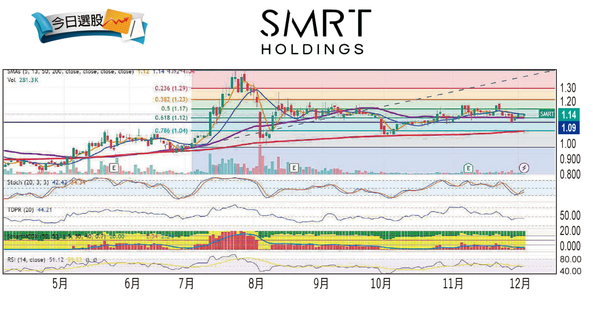 SMRT控股(SMRT,0117,创业板科技)周三(4日)闭市收在1.14令吉,扬升0.9%。该股在过去几个交易日里,一直在50天短期移动平均线(SMA)附近盘整,显示出稳固的基础。同时持续在1.14令吉测试13天SMA,表明买盘兴趣不减,该股已蓄势待发,准备突破此关键水平。