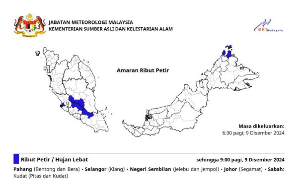 彭雪森柔沙 数区一早有雷雨 责任编辑: 前线小编 (吉隆坡9日讯)半岛和沙巴部分地区预计会迎来雷雨,直至早上9时。 气象局指出,涉及的半岛地区有彭亨(文冬和百乐)、雪兰莪(巴生)、森美兰(日叻务和仁保)和柔佛(昔加末)。 沙巴则涉及古达(必达士和古达)。 半岛和沙巴部分地区预计会迎来雷雨,直至早上9时。 更多不可错过的热门新闻,请到中国报官方WhatsAPP平台! 加入中国报官方Telegram:https://t.me/chinapressonline 高兴 惊讶 愤怒 悲伤 关怀