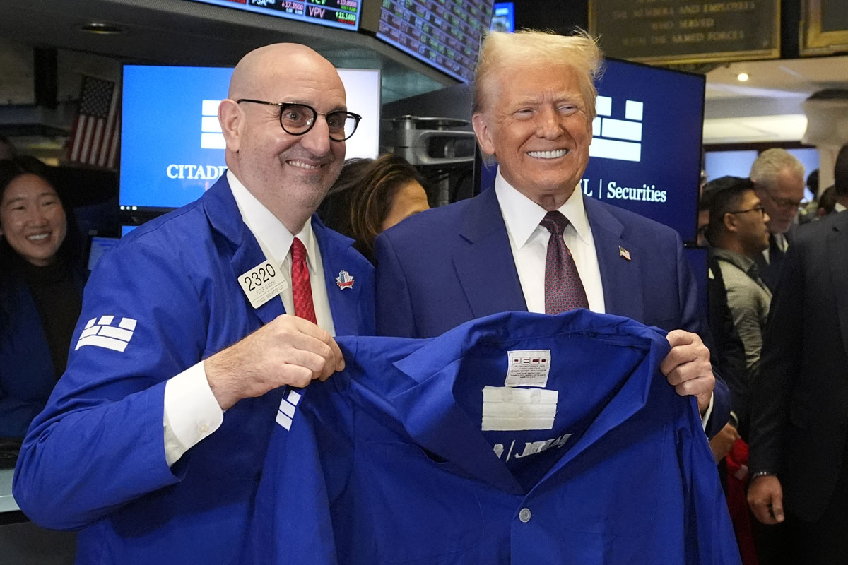 候任总统特朗普周四在纽约证券交易所大厅,获交易员贾基赠送了一件夹克。(美联社)