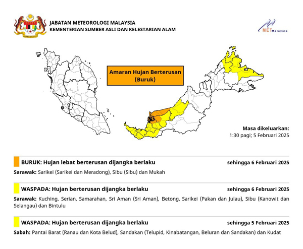 “砂拉越其他数个地区已发出警戒级别的持续降雨警告,包括古晋、西连、三马拉汉、斯里阿曼、木中、泗里街、诗巫和民都鲁。”