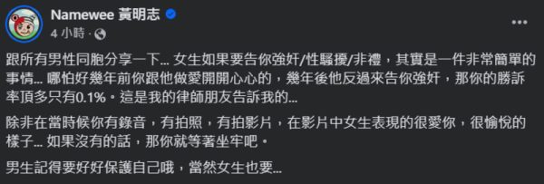 事后他发文补充,除非当下有录音、拍照、拍影片,女方在当中也表现得很爱、很愉悦,否则有99%机率败诉等着坐牢,最后更呼吁“男生记得要好好保护自己哦,当然女生也要”。