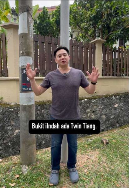 (吉隆坡24日讯)大马谐星林有信(Douglas Lim)日前发布视频,调侃住家附近的政府工程,竟在电线杆旁安装柱子,两根柱子像双塔楼并列,让他调侃是‘双子柱’(Twin Tiang)。